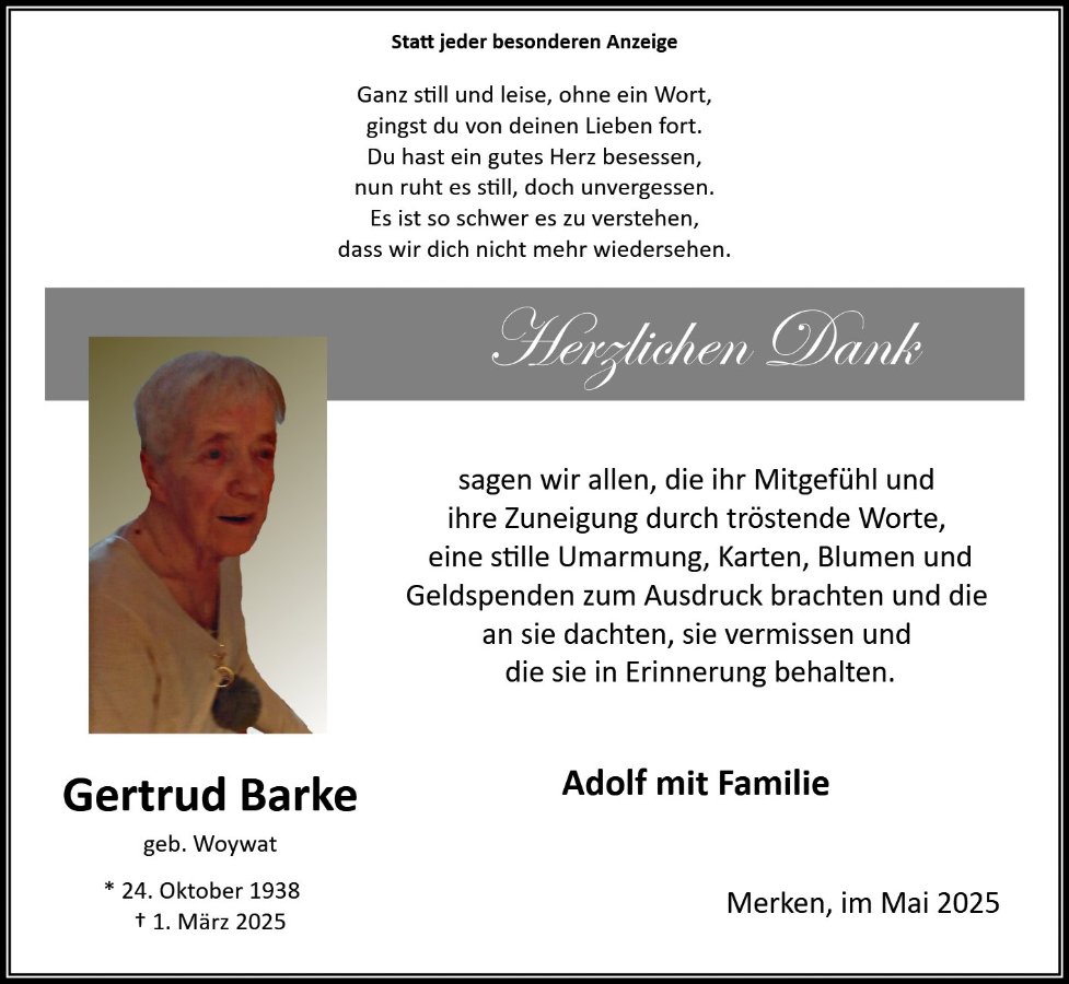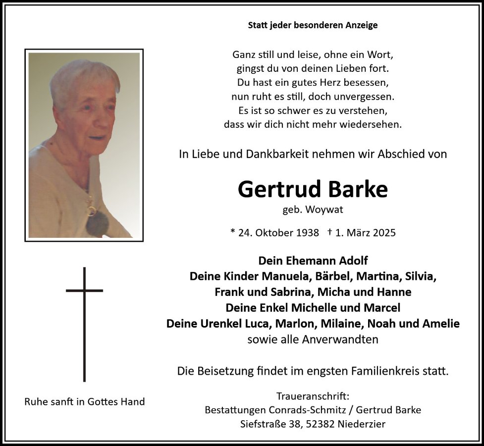 Mama,ich vermisse dich jeden Tag immer mehr, Papa fehlst du auch sehr, er denkt jeden Tag an dich. Er denk immer an die schöne Zeit zurück mit dir,du wirst immer in unseren Herzen bleiben für immer.von deinem Ehemann Adolf von Manuela.