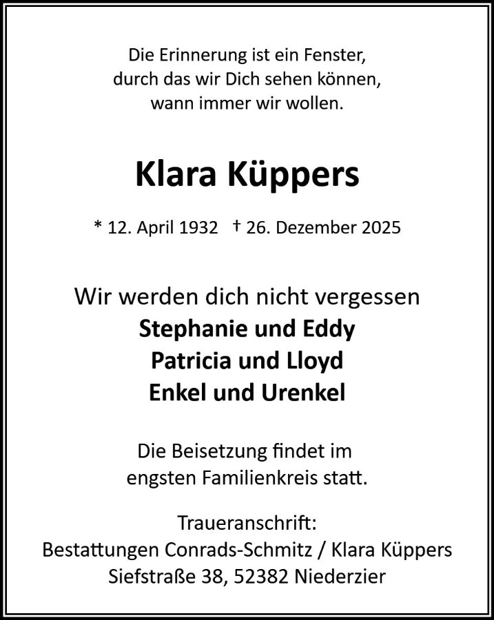 Schön das ich Sie kennenlernen durfte, liebe Klara. Den Angehörigen spreche ich meine Anteilnahme aus.