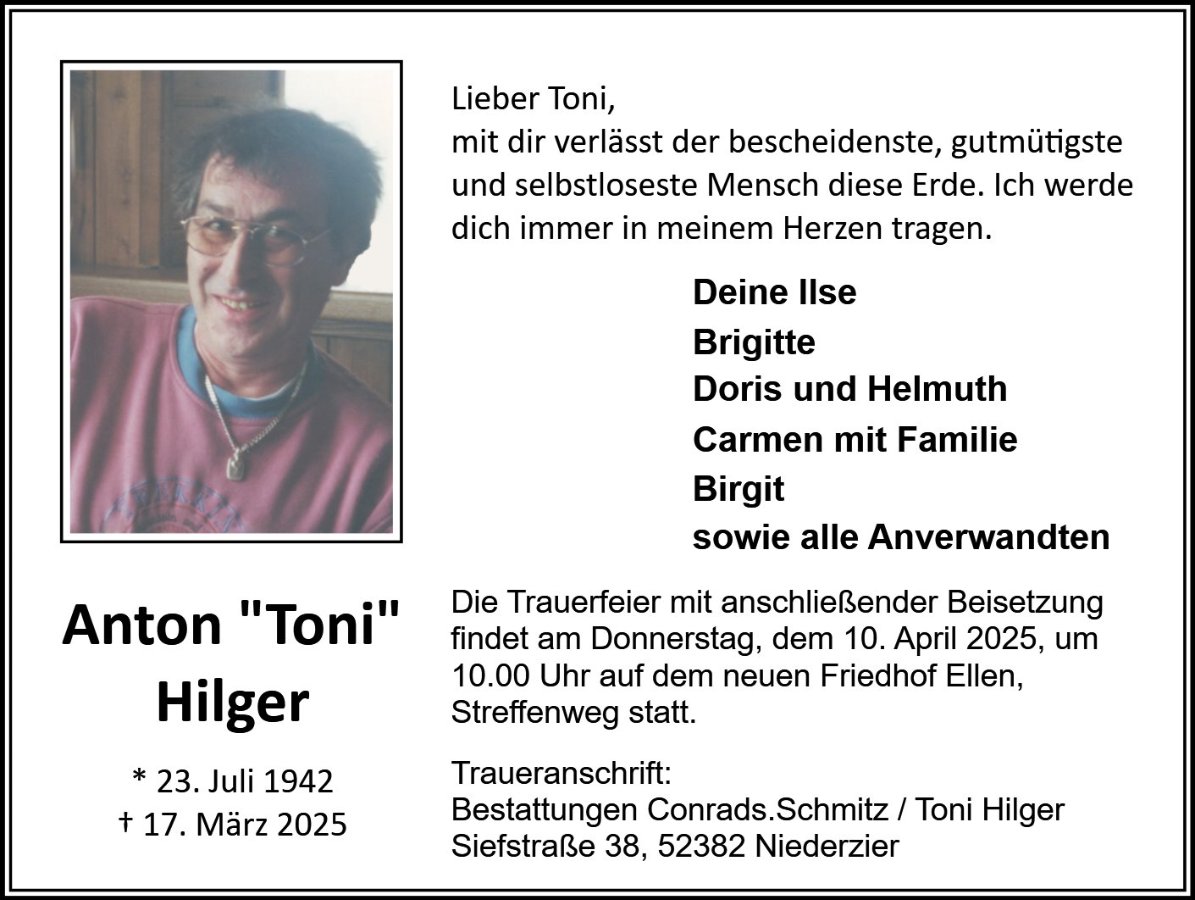 ich kannte Toni als Mitarbeiter der Ford Werke Düren. Dort hat er als Handwerker und Maschinenschlosser viele Jahre gearbeitet. Ein Kollege machte mich darauf aufmerksam, dass Toni verstorben sei.